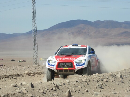 El piloto chileno Pablo Quintanilla comenzó de buena forma el Sonora Rally en la primera etapa de mayor duración al terminar tercero a 41 segundos de la punta. El ganador del día fue el español Tosha Schareina, que se estrenó al mando de una Honda fuera de la estructura oficial. Nacho Cornejo anotó la P16 a casi 9 minutos luego de tener que abrir ruta por los resultados del prólogo.