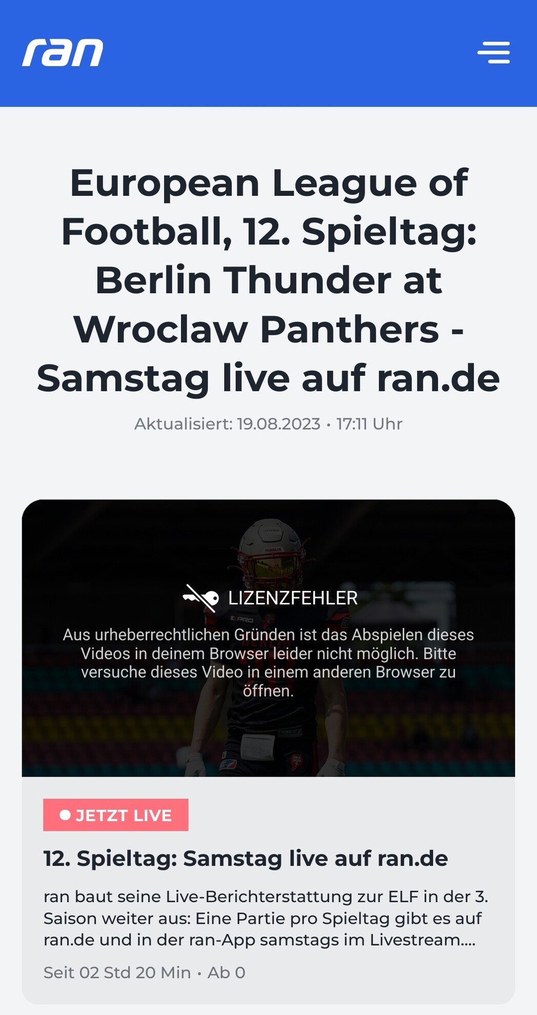 Irgendwie läuft es dieses Jahr nicht so. Weder für der Liga (seltsam hohe Pleiten), noch bei #ranELF... Die Panthers kommen aus Wrocław, liebe Kollegen aus der Ran-Redaktion.