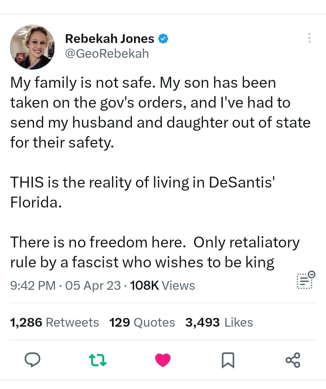 #rebekahjones a 3 year old son was arrested for posting a meme on a private chat board. An obvious plant by desantis told law enforcement about this nonsense meme that meant nothing and had him arrested as a threat. Now she sent her family out of #Florida for their protection.