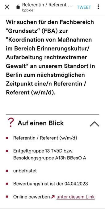 #Stellenangebot: Durch Zufall bin ich über eine spannende Stellenausschreibung @bpb gestolpert: https://www.bpb.de/die-bpb/karriere/519479/referentin-referent-w-m-d/! Dienstort ist Berlin, die Stelle ist unbefristet. Aufarbeitung #rechterGewalt und Gedenken an die Opfer sind zentrale Bestandteile der Stelle! #twitterstorians
