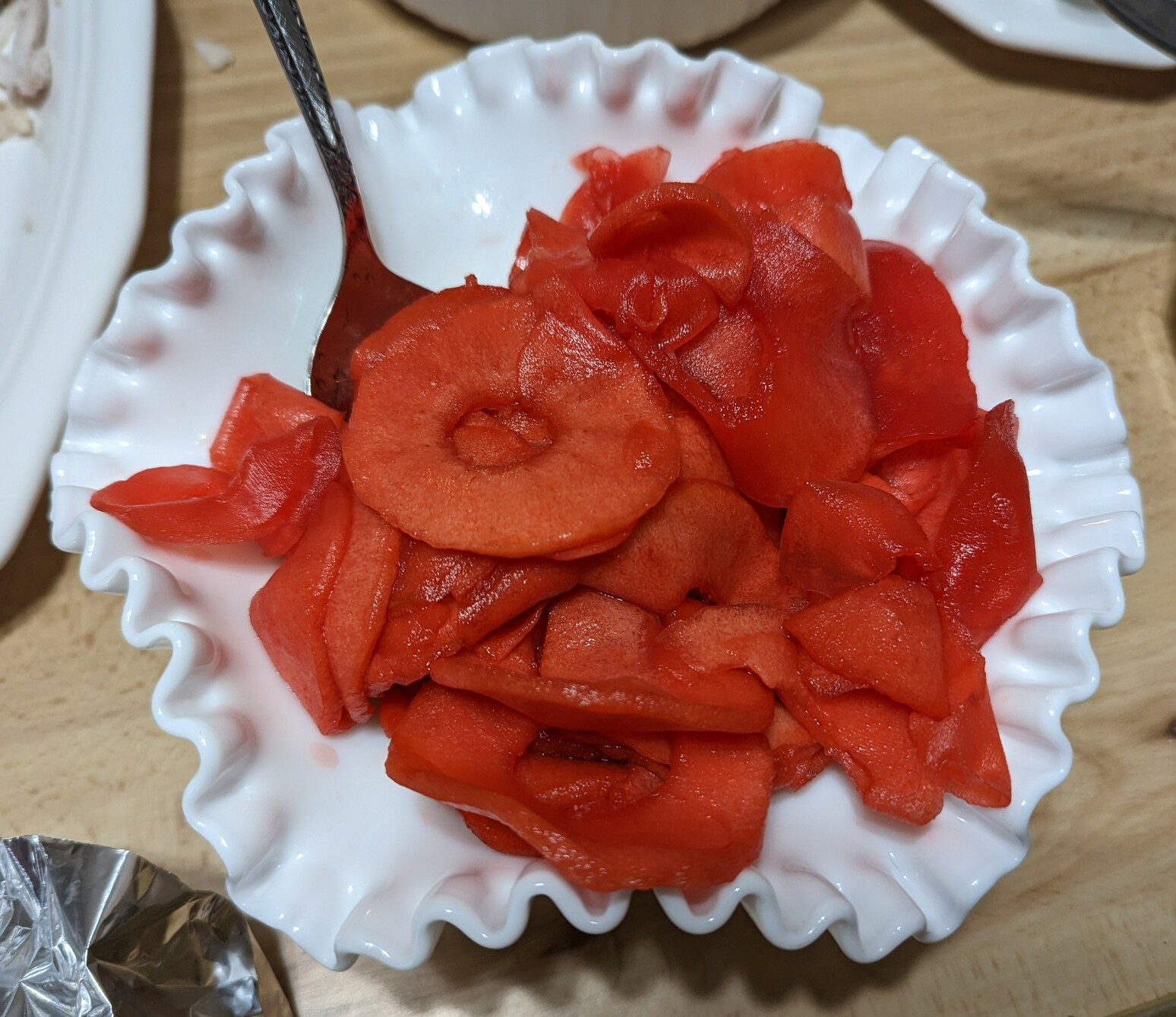 "Red apples" were one of my grandma's many specialties. Granny Smith apples, sliced thin, cooked in dissolved cinnamon red hots. I add cinnamon oil for extra kick, and let them sit in the cold garage for a few days.