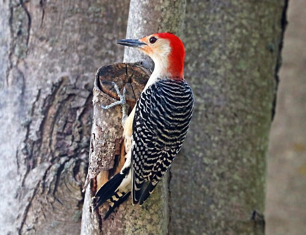 Notices how effortlessly this female, red-bellied woodpecker grips the side of the tree trunk.