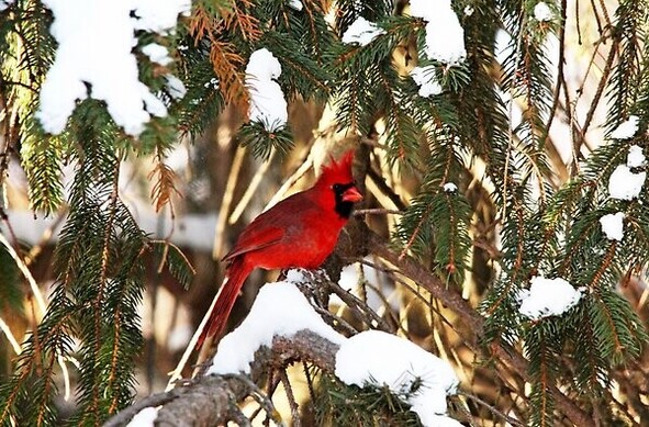 #NorthernRedCardinal perched on a snowy branch of the Spruce tree in winter sure adds much needed color to the season!