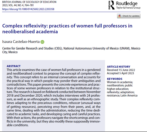 Hello everyone! 🙂 I am so happy to share that my latest article has been published in the current issue of British Journal of Sociology of Education. In this article, I propose the concept of 'complex reflexivity', building on Margaret Archer's work on #reflexivity, to explain the ambivalences of the practices of #women professors in #academia. Here is the link: https://www.tandfonline.com/doi/full/10.1080/01425692.2023.2203358