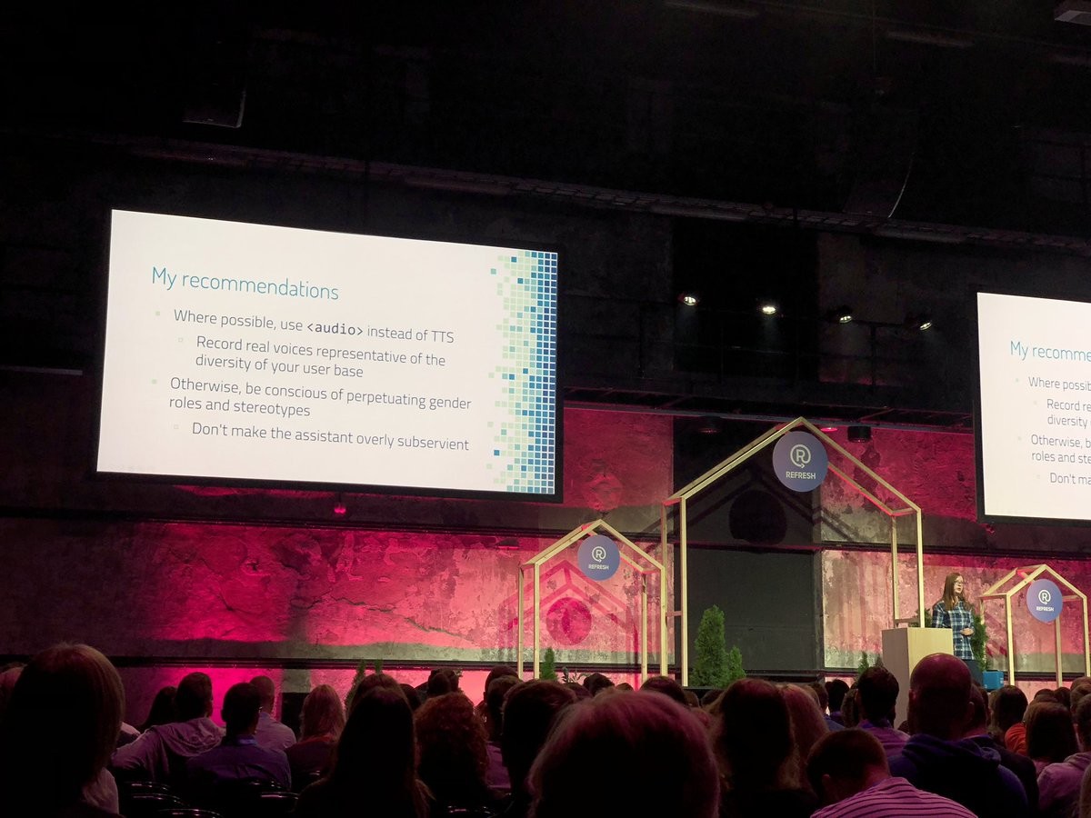 Interesting #RefreshRocks talk on gender roles and stereotypes in personal assistents by @xiehan@twitter.com from NPR. http://refresh.rocks/nara-kasbergen. Slides: https://speakerdeck.com/xiehan/refresh-principled-product-development-for-voice-based-interfaces. See screenshot for core recommendations.