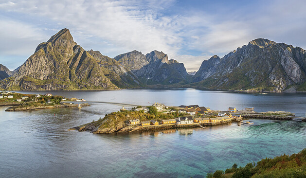 Arctic Norway Lofoten Islands Reine Skyline from Sakrisoya in tones of aqua: