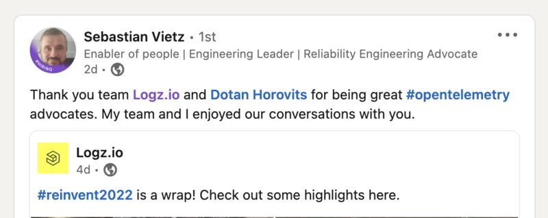 One of the highlights of #reinvent was meeting #community members in person, and getting feedback on the #opensource advocacy around #opentelemetry and other projects 🤩