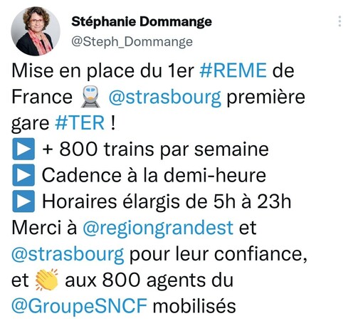 Un allongement du calendrier de mise en œuvre du #REME. Plus de trains dans les petites gares dès février, la montée en charge devrait être achevée en avril. La plus grosse difficulté serait la circulation en gare de #Strasbourg.