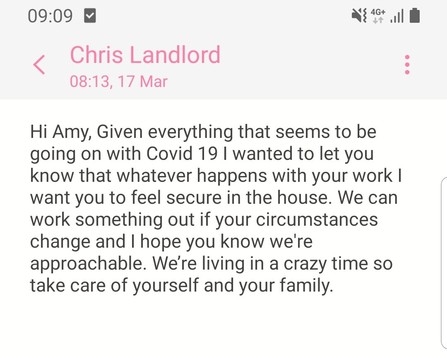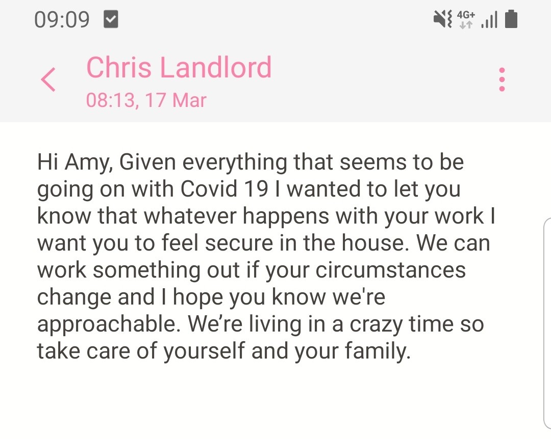 My landlord just text me this and I'm sobbing. LANDLORDS, TAKE NOTE. If you're in a position to say this to someone, please do. When we can't rely on the government, we've got to help each other. #COVID19 #rentfreeze #landlords