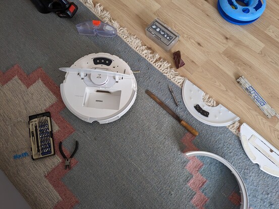 I bought a used vacuum robot. The seller claimed it to be refurbished. While it had low run hours, it had issues with the bumper sensors. They were too sensitive and stopped the vacuum multiple times during cleaning (Error 2. “Bumper stuck. Lightly tap it to release it.”). But it wasn't stuck. First I didn't want to fix it myself because I don't have time for it, but then the seller offered a 30% price reduction if I keep it. So I looked into it. The more popular solution is to replace the sensors, but I would have had to fully disassemble the vacuum. I went with the more destructive solution and filed off a millimeter of the prongs that are attached to the bumper sensors. To reduce wear (they scratch across the inside of the bumper), I sanded away any sharp ends. The prongs can be reached with minimal disassembly: Pop open the hood, remove the screws at the bottom that hold the bumper and you are done.