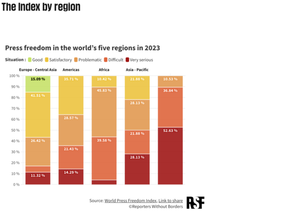 "According to the 2023 World Press Freedom Index the situation is “very serious” in 31 countries, “difficult” in 42, “problematic” in 55, and “good” or “satisfactory” in 52 countries. In other words, the environment for journalism is “bad” in seven out of ten countries, and satisfactory in only three out of ten."