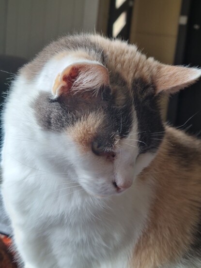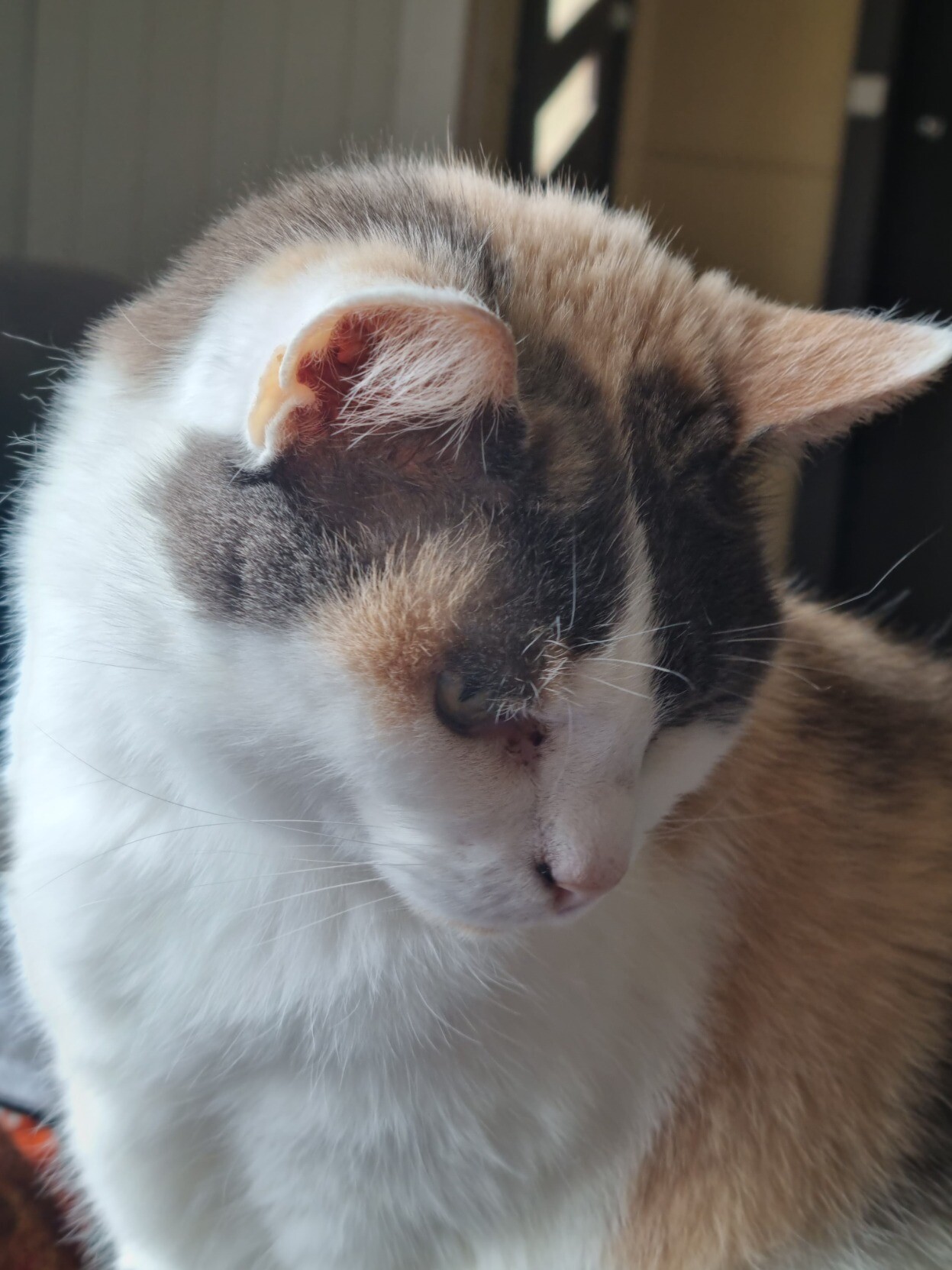 This is Alice. She was an unwanted Christmas kitten we took in about 13 years ago. She has odd colouring, strange eyes, a stubby nose and is knock kneed, and for a long time didn't like being held, stroked or touched. She was very quiet, and ran away at loud noises.