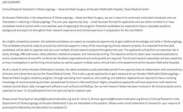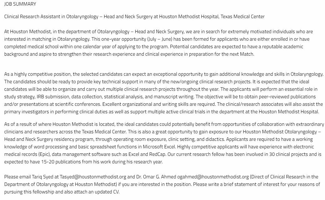 ENT Research Assistant Position at Houston Methodist Hospital. Details in the image below. #InsideTheMatch #researchopportunity #research #ENT #otolaryngology