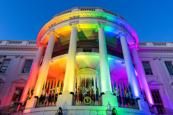 There are few things as clear and right as marriage equality.” - President Joe Biden #RespectForMarraigeAct #SameSexMarriage #MarriageEquality #LGBTQ+ (Alt-text: WH lit in rainbow colors. Bill-signing ceremony around table in Rose Garden.)