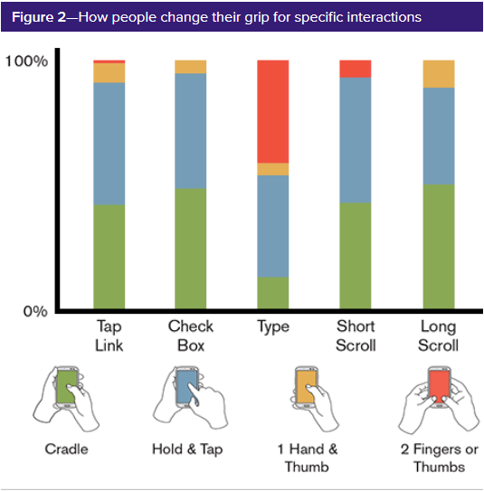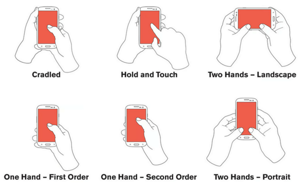 Interesting: "People hold their mobile devices in multiple ways and change their position all the time. This has an impact on what finger(s) they use and how they interact with a mobile UI (see below). As it turns out, users prefer the center of the screen and they don’t like to click items that are too close to the edges."