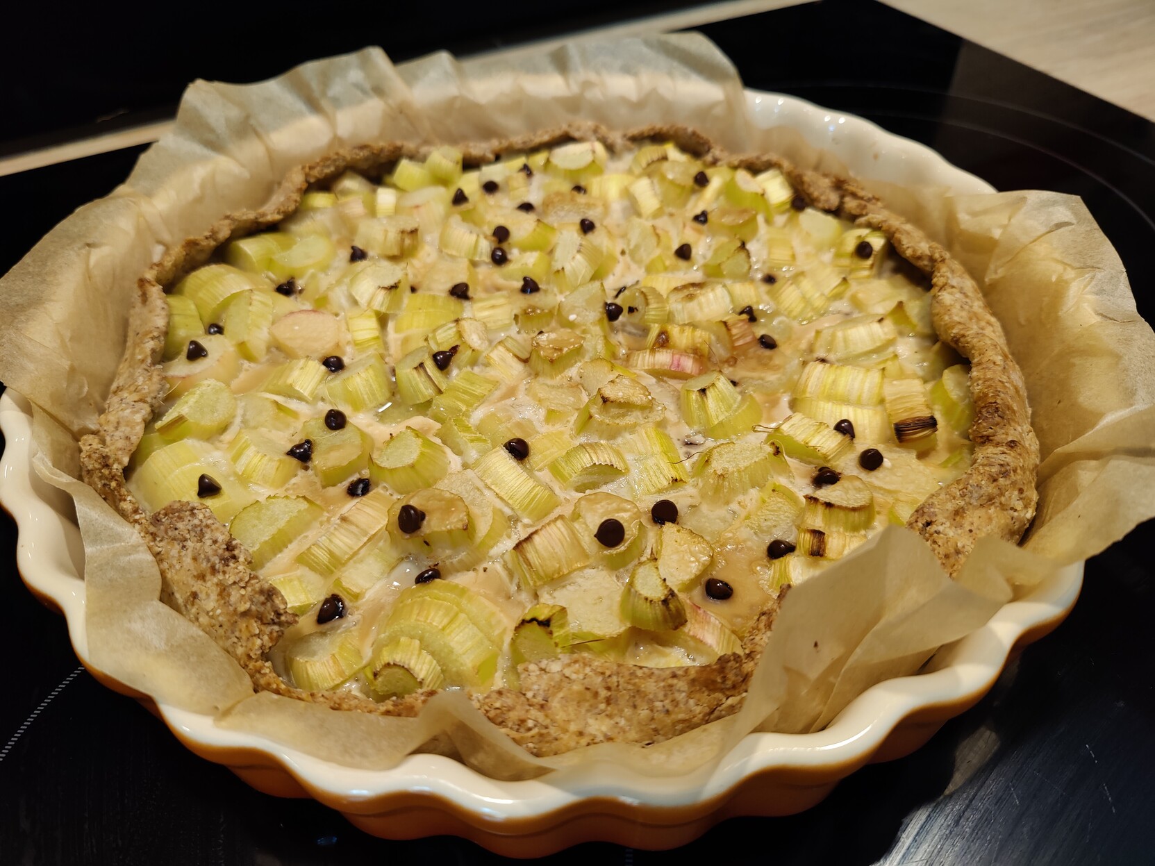 Il restait une derniĂšre dĂ©clinaison pĂątissiĂšre de la rhubarbe non encore testĂ©e cette saison : la tarte. Donc aujourd'hui, ce fut tentative de tarte Ă la rhubarbe vegan Ă partir de cette recette : https://deliacious.com/2016/06/tarte-rhubarbe-vegan-creme.html SuccĂšs auprĂšs des gourmands de la maison, mĂȘme si j'avais bien rĂ©duit le sucre.