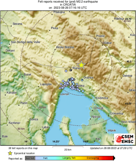 #Earthquake 17 km N of #Rijeka (#Croatia) 20 min ago (local time 20:44:05). Updated map - Colored dots represent local shaking & damage level reported by eyewitnesses. Share your experience via: