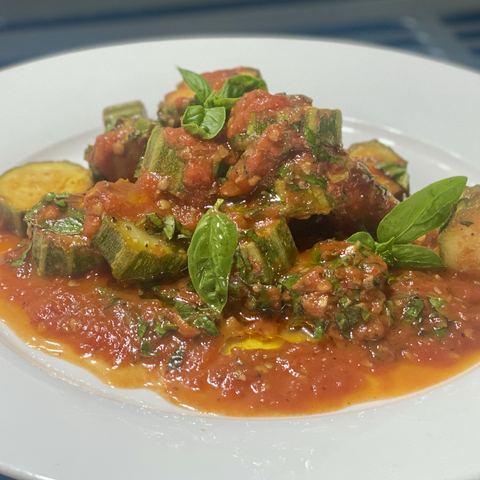 Courgettes with fresh tomato sauce from #RiverCottage #MuchMoreVeg using #homegrown tomato, zucchini, garlic & basil - served with #homemade sourdough #mymenuplan