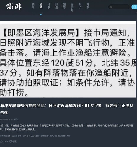 Obs: ej bekräftat av icke statskontrollerad media. Kan vara del av propagandakriget eftersom USA anklagat Kina för att ligga bakom den misstänkta spionballong som sköts ner den 4 februari. #Rizhao