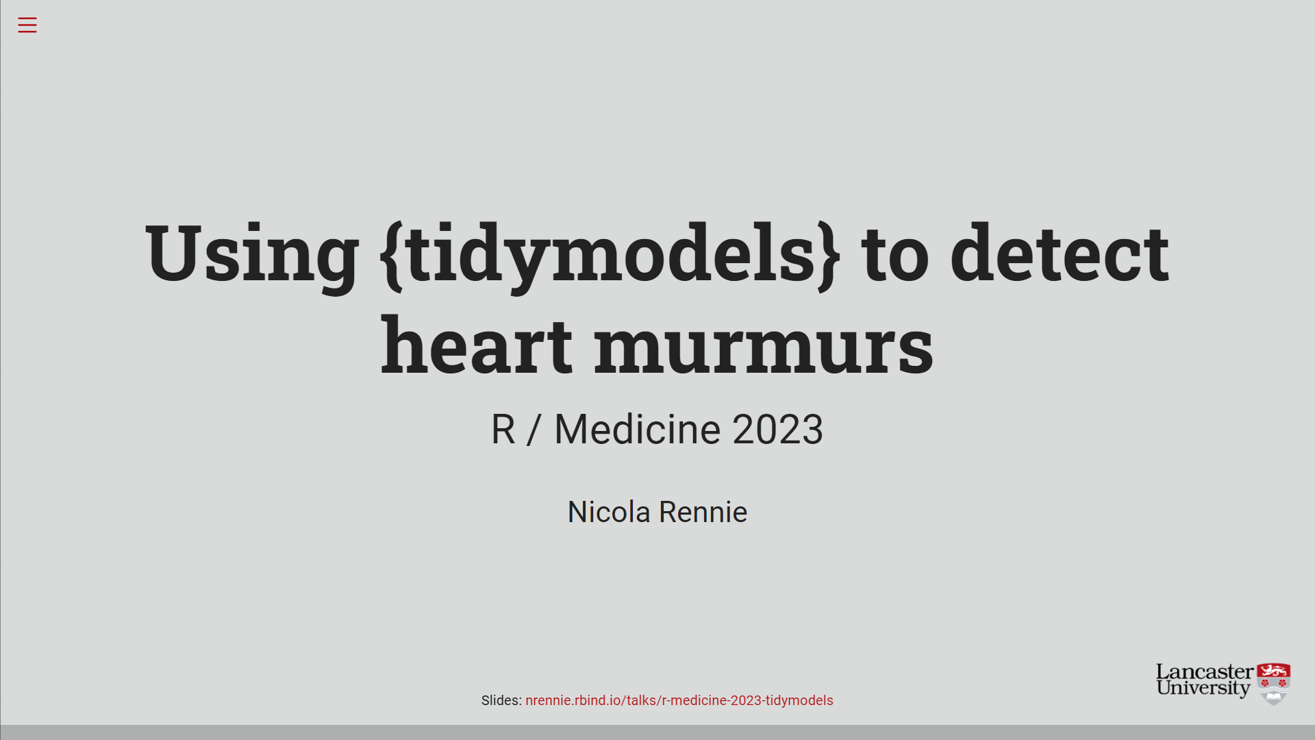 Session link: https://rmed2023a.sched.com/event/1MwUo/using-tidymodels-to-detect-heart-murmurs-nicola-rennie-lancaster-university