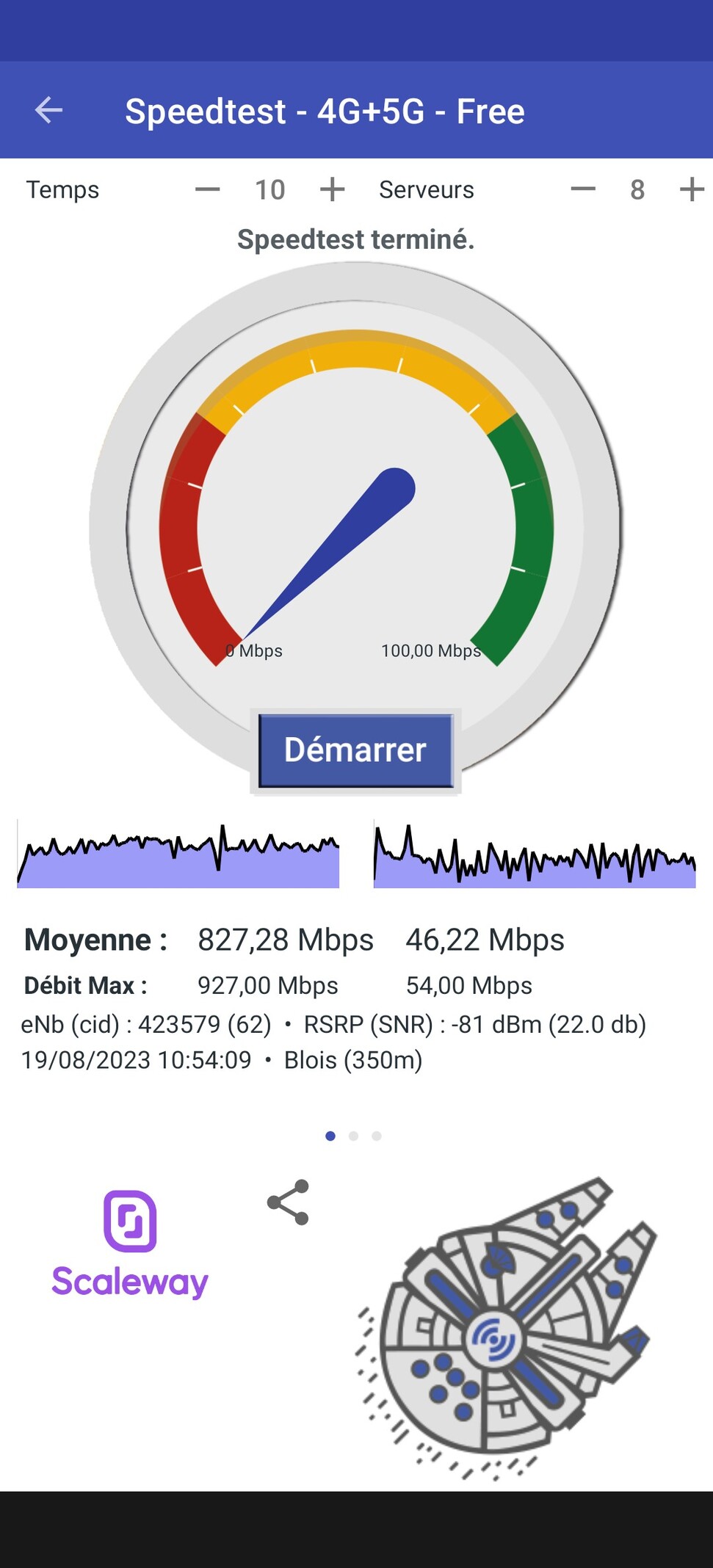 Speedtest #RNCMobile 4G+5G de 10 sec. sur IN2023: 827,29 (Down) 46,22 (Up) réalisé sur le RNC 423579 (Blois)