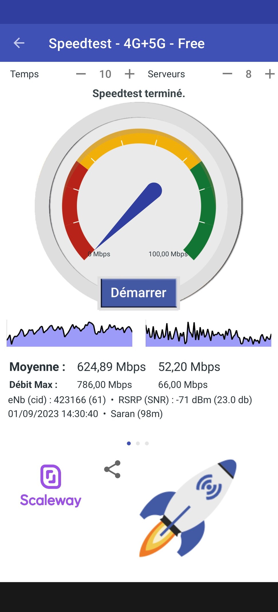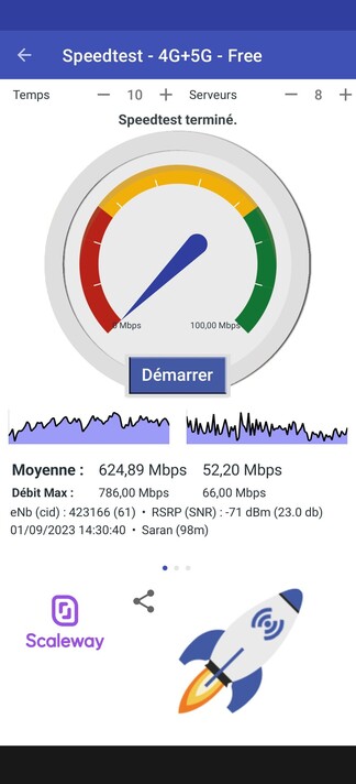 Speedtest #RNCMobile 4G+5G de 10 sec. sur IN2023: 624,9 (Down) 52,2 (Up) réalisé sur le RNC 423166 (Saran)