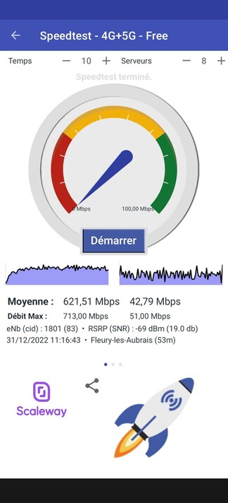 Speedtest #RNCMobile 4G+5G de 10 sec. sur IN2023: 621,51 (Down) 42,79 (Up) réalisé sur le RNC 401801 (Fleury-les-Aubrais)