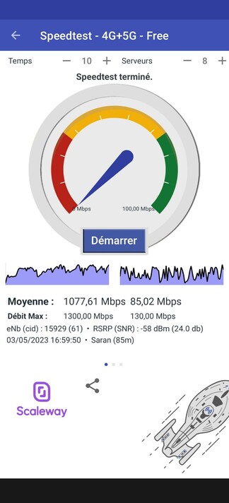 Speedtest #RNCMobile 4G+5G de 10 sec. sur IN2023: 1077,61 (Down) 85,02 (Up) réalisé sur le RNC 15929 (Saran)