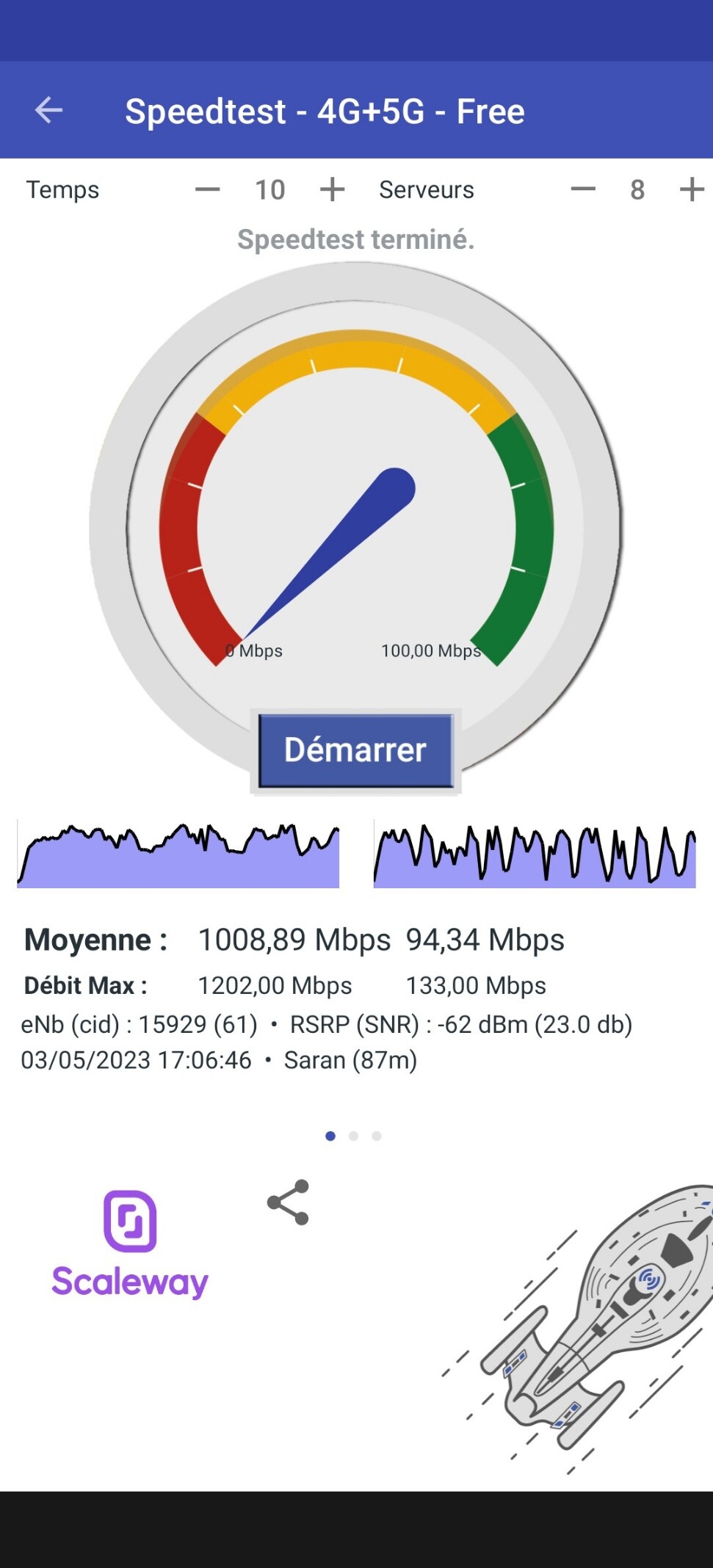 Speedtest #RNCMobile 4G+5G de 10 sec. sur IN2023: 1008,89 (Down) 94,35 (Up) réalisé sur le RNC 15929 (Saran)