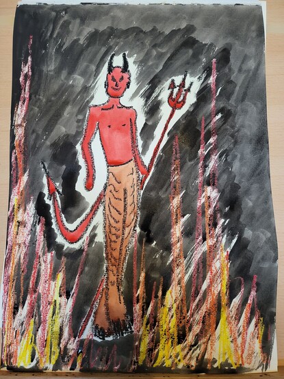 ALT TEXT: a devil holding a trident coloured red against a background of fire and darkness