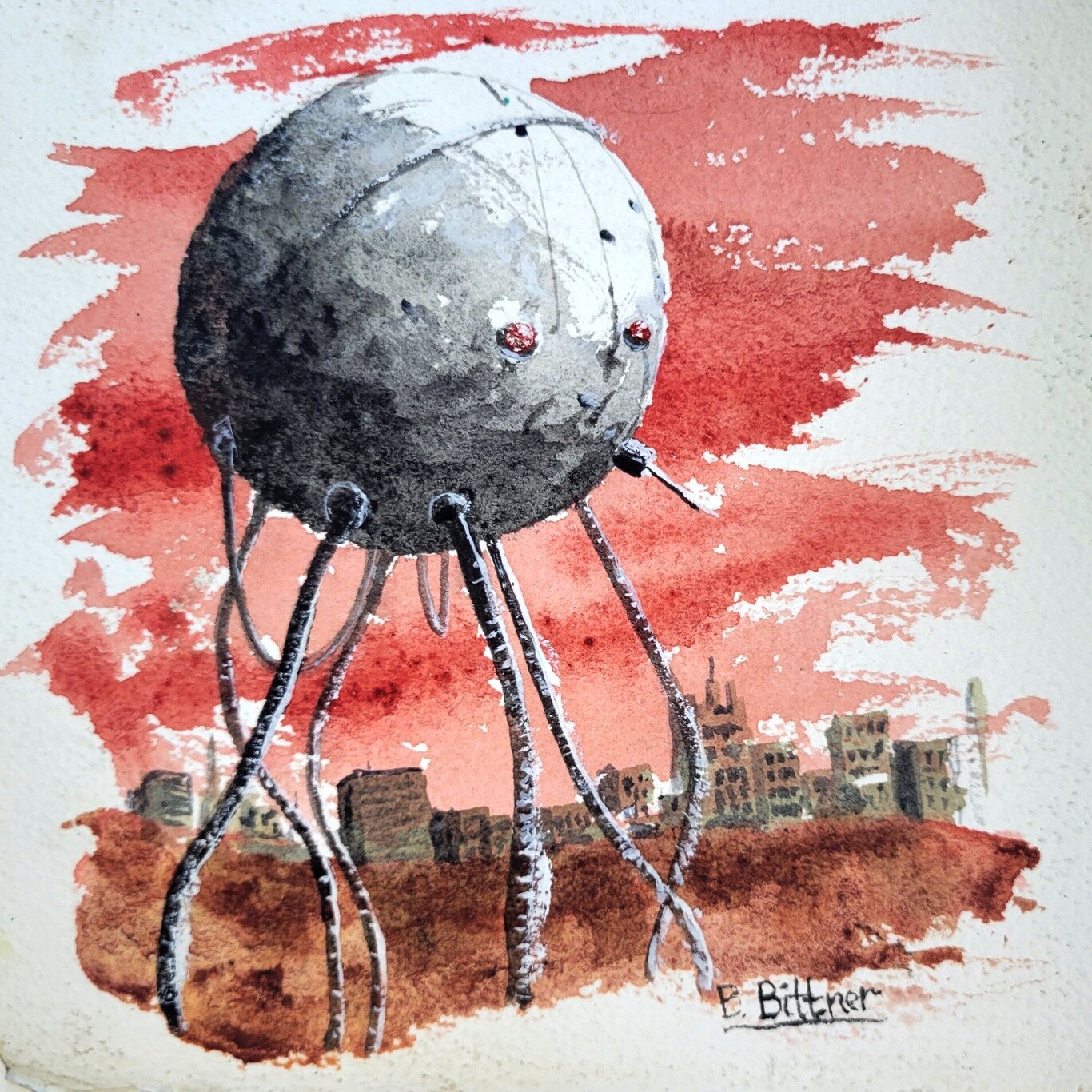I had this piece of paper in my backpack on a hike, and it got a little messed up and muddy in the rain. I thought a sort of apocalyptic painting might be a good fit for it (hate to see it go to waste) and it gave me a chance to draw a robot.