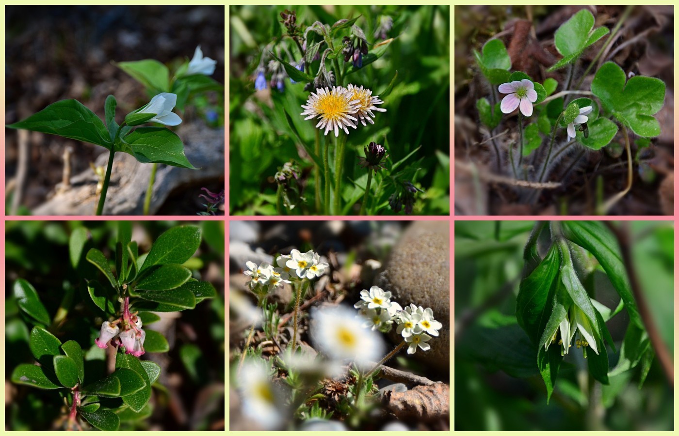 top left+right Trillium grandiflorum, Hepatica americana both from Ontario; centre Central Asian Taraxacum pseudoroseum with local Mertensia paniculata;