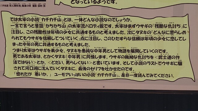 太宰治のカチカチ山はよかった。特にラストシーンで中年男が親指を立てながら河口湖に沈んでいくシーンは涙無しには見られなかった #rogy14山梨旅行2023 #らりおactivity