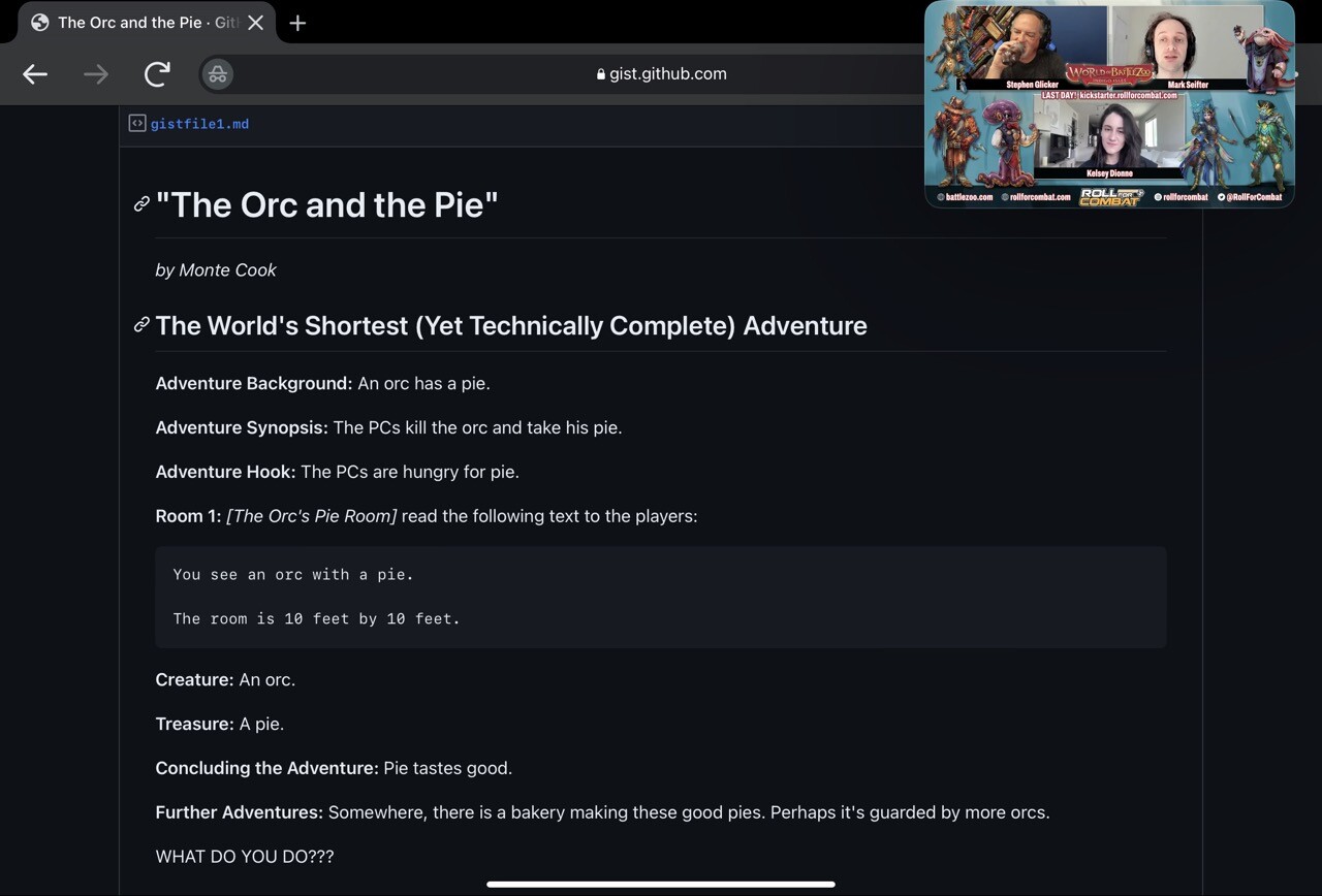 Thanks to a recent #RollForCombat podcast, I learned about the famous Monte Cook “The Orc and the Pie” adventure: https://gist.github.com/kerrizor/4165372 #RPG #RPGs #TTRPG #TTRPGs