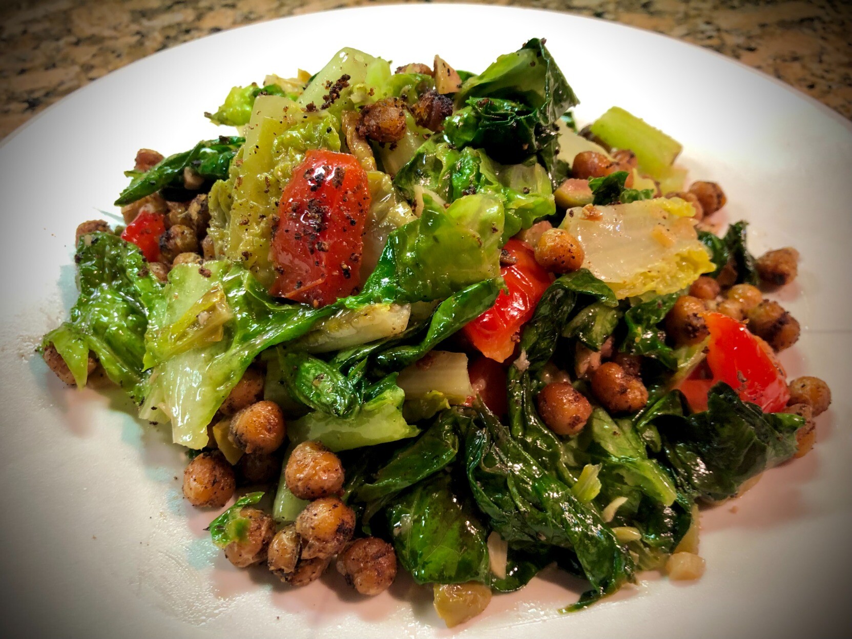 Sautéed #romaine lettuce #salad with minced garlic, pepperoncino, chopped green olives, celery, red sweet peppers, fried chickpeas with garlic and smoked paprika, and generous olive oil and the juice of a fresh lime. #Vegetarian #vegan #food