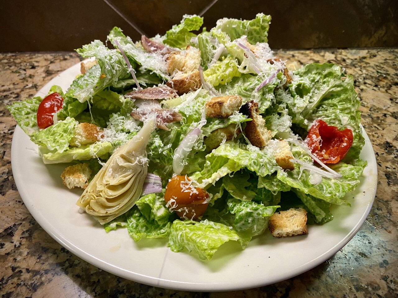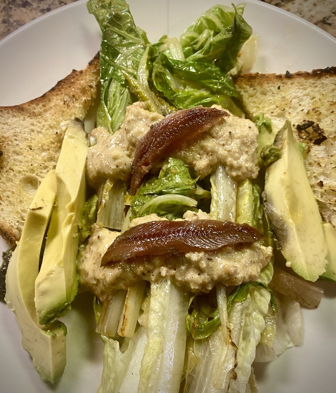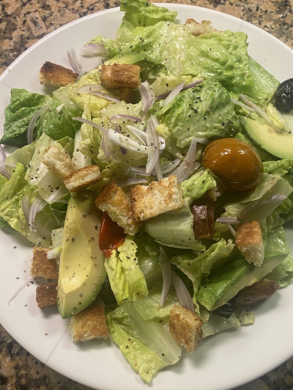 #Romaine #salad with #avocado dressing, croutons, thinly sliced shallots, black cured olives, piquant peppers.