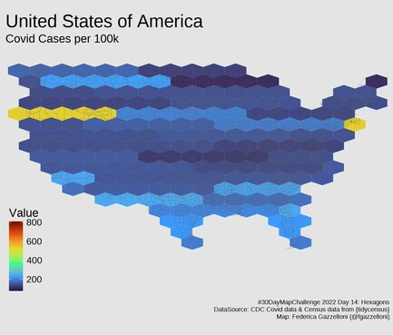 Data is from CDC Covid data per 100K population and {tidycensus} used geom_hex() from {ggplot2}.