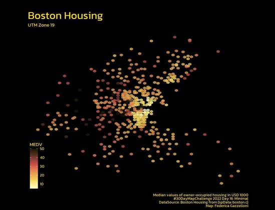 Boston housing data from spData::boston.c colored by Median values of owner-occupied housing in USD 1000