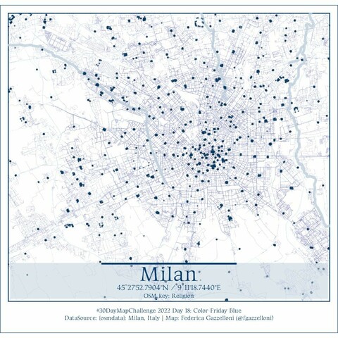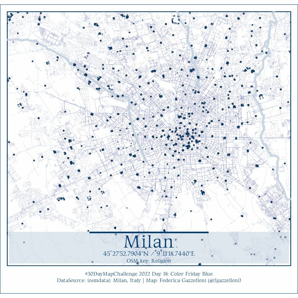 Data OSMdata key: Religion & Streets & Rivers of Milan, Italy.