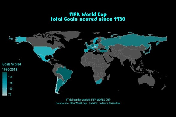 #TidyTuesday week 48 FIFA WORLD CUP total Goals scored since 1930 ⛹️♀️⛹️♀️⛹️⛹️