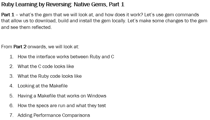 Part 1 of my new "Learning by Reversing" series explains how a native gem looks in #ruby. It covers the background to the gem we explore. From Part 2, we'll look at how the bits hold together.