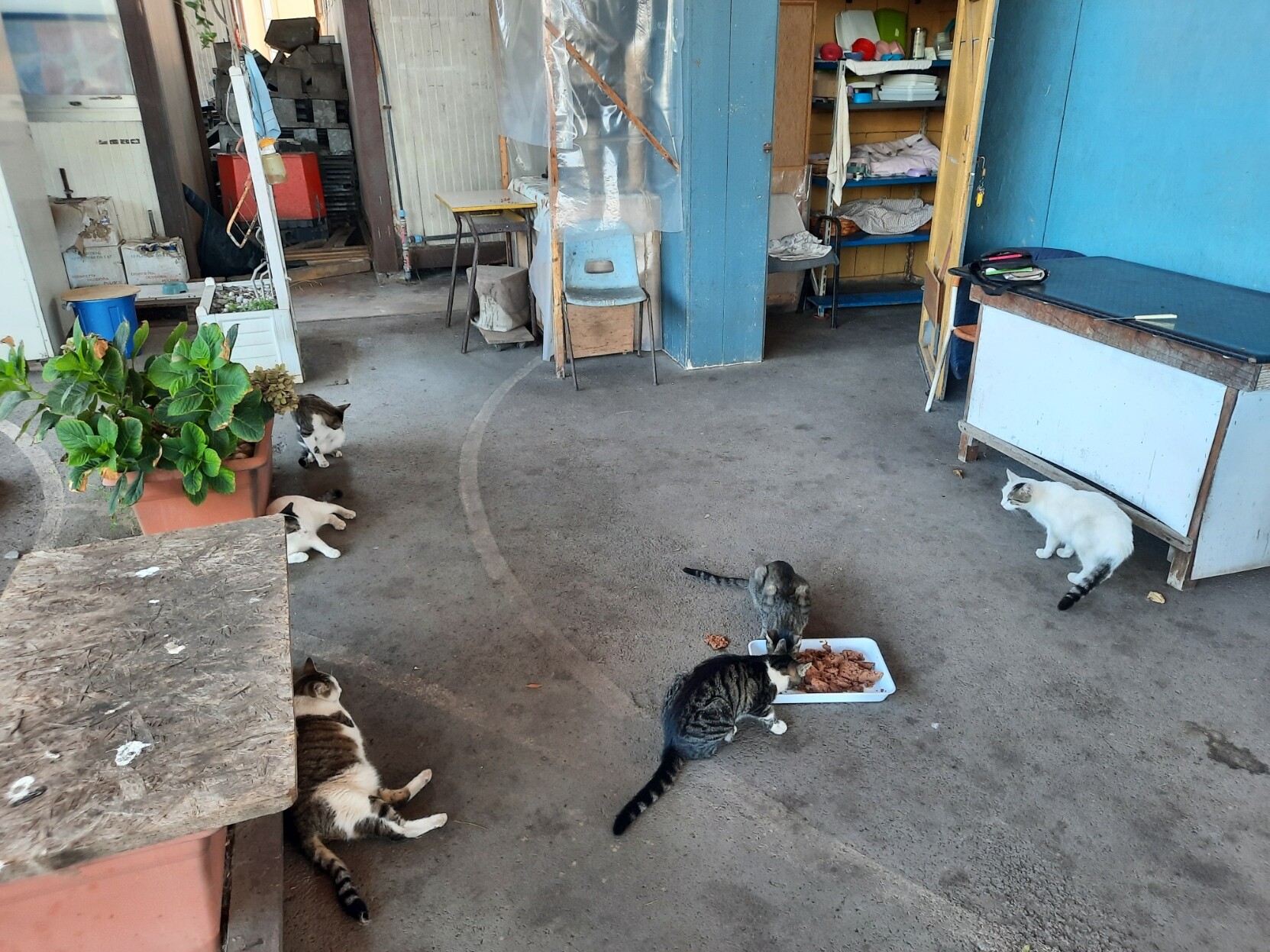All'esterno gli utenti abituali (al momento è bassa stagione); i deboli (anziani, malati terminali, ecc.) sono alimentati singolarmente tenendo a distanza i loro simili e quei bastardi dei gabbiani.