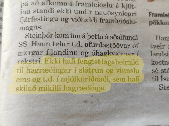 Semsagt, við erum ekki (enn) buinn að fá leyfi að vera einoku og vera undanþegin samkeppnis lögum. "lagaheimild til hagræðing" er mjög fínt doublespeak: Source https://www.mbl.is/frettir/innlent/2023/03/22/stefnir_i_kjotskort_a_innlendum_markadi/