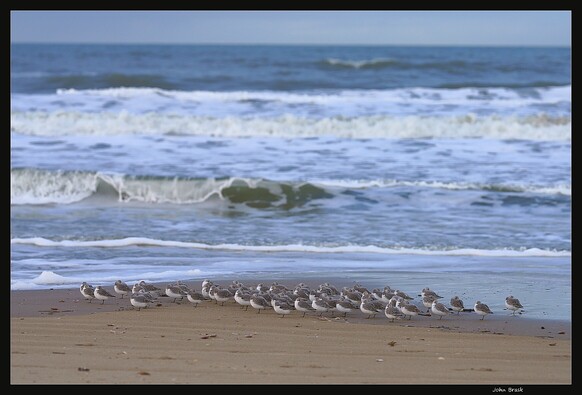 "The Sanderling’s black legs blur as it runs back and forth on the beach, picking or probing for tiny prey in the wet sand left by receding waves. Sanderlings are medium-sized “peep” sandpipers recognizable by their pale nonbreeding plumage, black legs and bill, and obsessive wave-chasing habits." - allaboutbirds.com