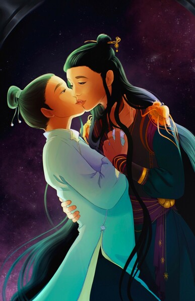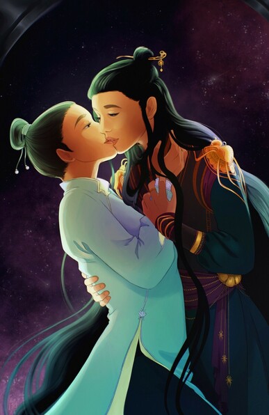 Oh hey look at this pretty art I commissioned of the main characters of my book The Red Scholar's Wake! It's by Elizabeth Alys (@dungeonmistrix on the bird site). Isn't it STUNNING?