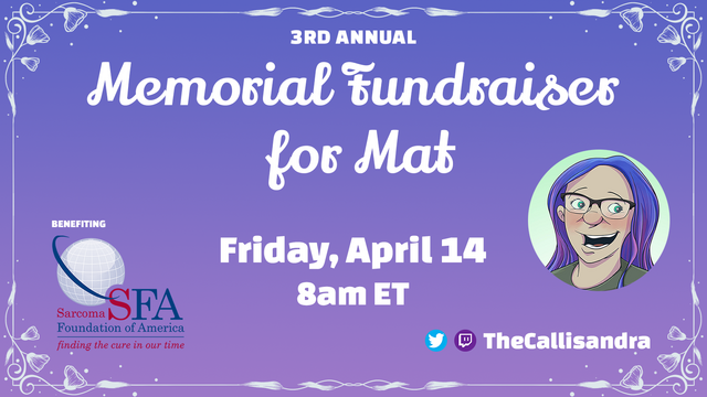 Announcing my 3rd annual Fundraiser for @curesarcoma in memory of my brother. 8am EDT-8pm Twitch.tv/thecallisandra