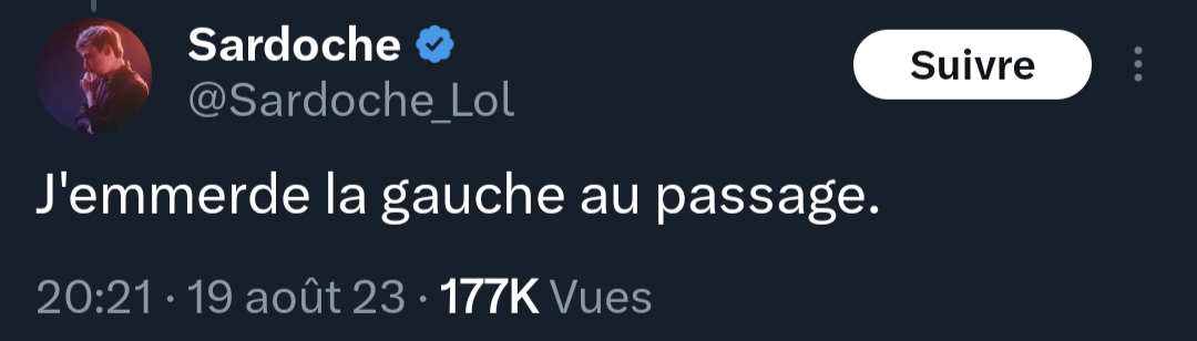 Je me tais depuis des annĂ©es sur Sardoche car je veux croire en la rĂ©demption et au fait qu'il soit devenu quelqu'un de dĂ©cent mais vu ses prises de parole rĂ©centes force est de constater que non et ma conscience mâinterdit de continuer Ă me taire