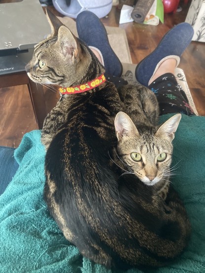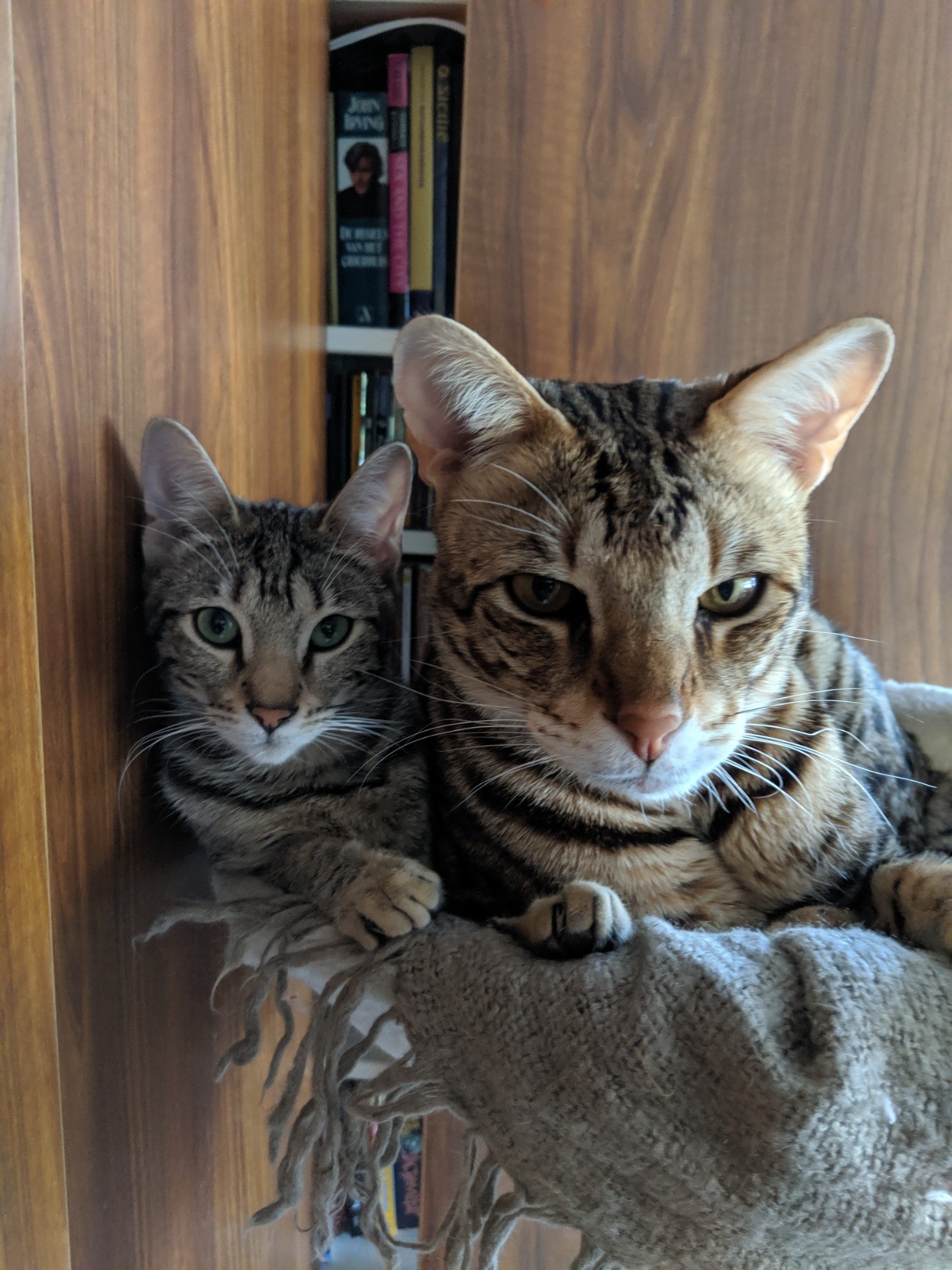 Finally, #cats! I have two #SavannahCats (Akio and Demi) and two #Bengals (Kaya and Jamilla). Akio is a giant 22lbs tomcat, pictured here with Demi when she was a kitten. Savannahs and Bengals have a lot of energy, and can get very destructive when they're bored. We take both Akio and Kaya (and sometimes Jamilla) on daily walks around our garden. (Kaya also sprays, despite being neutered, so he lives in a granny annex with large catio rather than in the main house.)