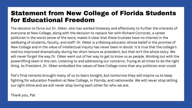 #saveNewCollege from #desatis “Gov. Ron DeSantis has appointed ultra-conservative political figures to the New College Board of Trustees. They want to rebrand it as the “Hillsdale College of the South,” revising New College’s curriculum to follow the classical education standards used at the private Christian college in Michigan. But the goal of higher education should not be to create a homogenous group of citizens – it should be to nurture broad thinkers.”