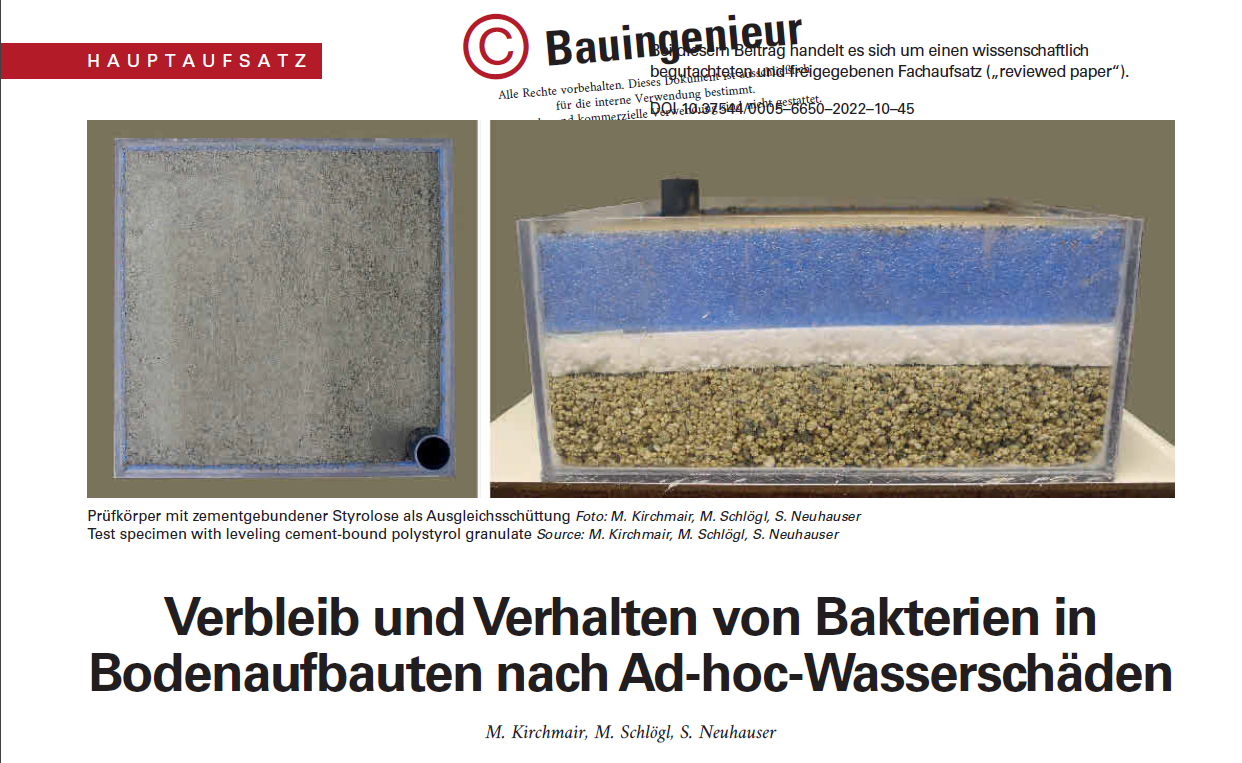 Wir haben im letzten Bauingenieur ein paper zum Thema "Verbleib und Verhalten von Bakterien in Bodenaufbauten nach AdHoc Wasserschöden“ veröfentlicht. DOI:10.37544/0005-6650-2022-10-54